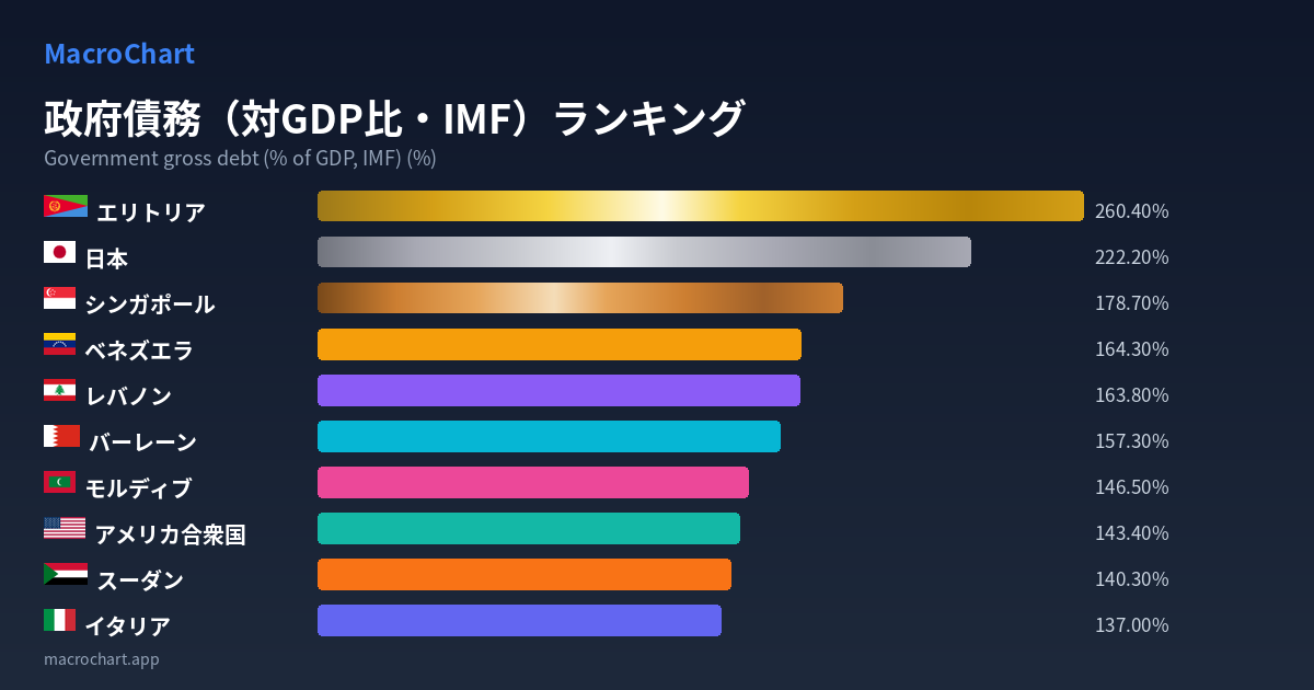 政府債務(対GDP比)は、国の総借金がその経済規模に占める割合を示す指標です。比率が高いほど、政府が多くの借金を抱えていることを意味します。先進国の中でも日本やイタリアは比率が高く、財政赤字や社会保障費の増加が背景にあります。一方、オーストラリアやスイスなどは比率が低く、堅実な財政管理が特徴です。この指標は、長期的な経済の持続可能性や国債の信用度、将来の増税や歳出削減の必要性を判断する上で重要な目安となります。