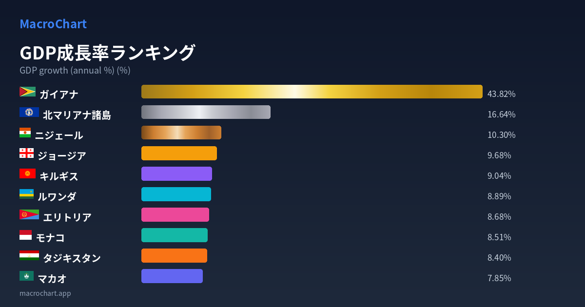 GDP成長率は、各国の経済がどの程度の速さで拡大しているかを示す重要な指標です。ランキングの上位には、発展途上国や新興経済国が多く見られ、これらの国は急速な産業化やインフラ整備による高い成長を実現しています。一方、下位には成熟した先進国が並ぶ傾向があり、既に経済規模が大きいため成長率は相対的に低くなります。ただし負の成長率を示す国は経済が縮小している状態で、景気後退や構造的な問題を抱えている可能性があります。各国の成長率は景気サイクルや世界経済の変動に大きく影響されるため、複数年のデータで傾向を観察することが重要です。