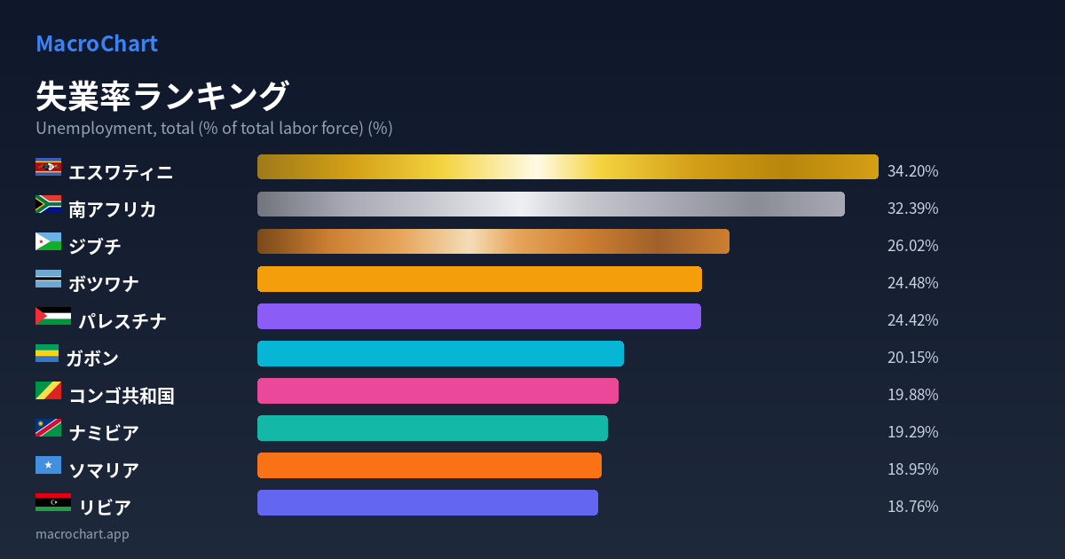 失業率は労働力人口に占める失業者の割合を示す重要な経済指標です。この指標が低いほど雇用情勢が良好で、経済が安定していることを意味します。上位(失業率が高い)の国は経済成長の鈍化や構造的な雇用問題を抱えている傾向があり、下位(失業率が低い)の国は労働需要が強く経済が活発な場合が多いです。ただし国によって労働統計の定義や集計方法が異なるため、国際比較の際は注意が必要です。失業率は景気動向を反映する先行指標として、政策立案や投資判断の参考になります。