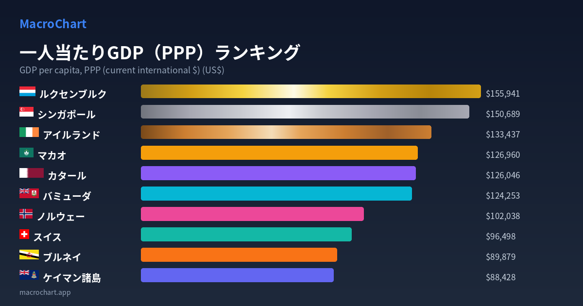 一人当たりGDP(PPP)は、購買力平価を用いて各国の実質的な生活水準を比較する指標です。為替レートの変動に左右されず、各国の物価水準を考慮した真の経済規模を測定できます。ランキング上位にはルクセンブルクなどの小国や産油国が多く、高い生産性と豊富な資源が特徴です。一方、下位国は発展途上国が占め、産業基盤の脆弱さと低い労働生産性が課題となっています。この指標は国民の平均的な豊かさを知る上で重要で、経済発展レベルの国際比較に広く活用されています。